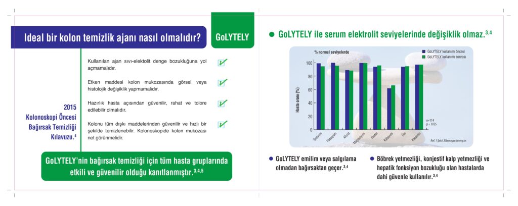 ASGE, Kolonoskopi Öncesi Bağırsak Hazırlığı 2015 Kılavuzu`nda elektrolit bazlı PEG içeren GoLYTELY`İ “Stabdart Kriter olarak Tanımlamaktadır”