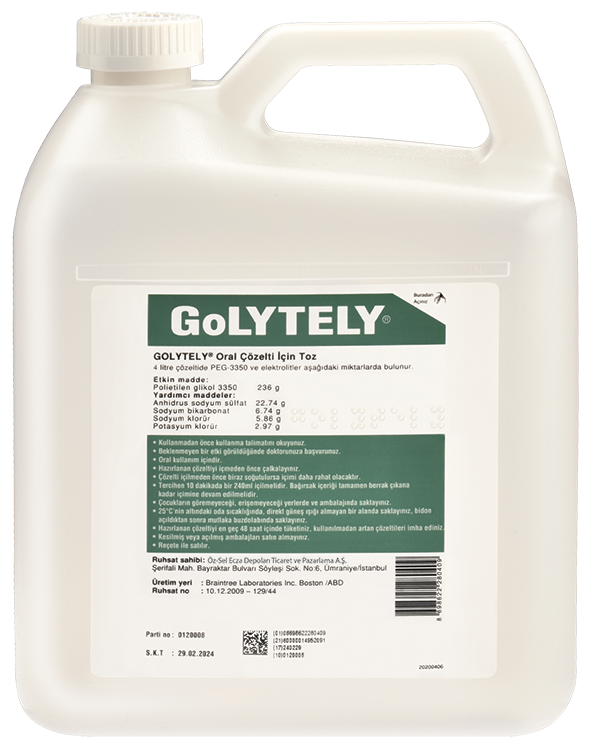 Kolonoskopi veya baryum enemalı röntgen muayeneleri öncesi hızlı ve derinlemesine bağırsak temizliği için endikedir.