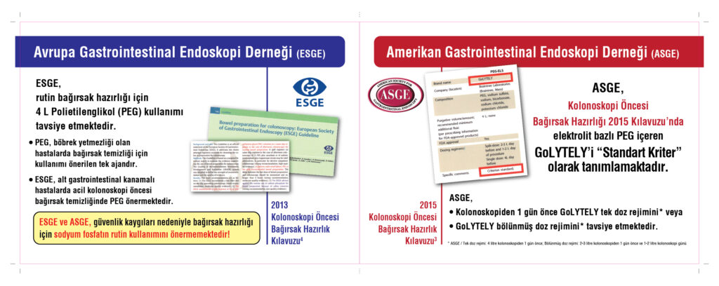 ASGE, Kolonoskopi Öncesi Bağırsak Hazırlığı 2015 Kılavuzu`nda elektrolit bazlı PEG içeren GoLYTELY`İ “Stabdart Kriter olarak Tanımlamaktadır”